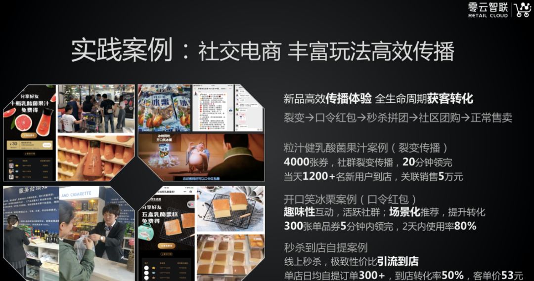 另外还有一个比较有意思的案例。在当地一个四线城市,在模仿一线城市做爆浆蛋糕,做了一点改进,把做爆浆蛋糕过程拍成视频,稍微加了内容营销东西,抛到社群以后,几乎一百个爆浆蛋糕,几分钟就抢掉,这种东西线下烘焙店,需要很长时间的销售,社群的威力,所以这对商品的威力是蛮大的。 这点我们愿意着重和今天的嘉宾分享一下,我们感觉新的消费品牌在一二线城市的线上推广非常好做,但到了低线城市,由于商品信息分散,渠道垄断非常单一,导致新品牌进入低线城市的效率很低,效果很差,很多品牌想进很难。我们试着和传统零售企业合作,看看能不能用些其他的方法。 第一个方法叫裂变。以粒汁健乳酸菌果汁案例,方法大概是分享朋友,别人领一张体验券,我也可以领一张体验券,最多可以领10张每个人。大概被分享了几万次,其中4000人领了这个体验券,有1200人到了门店,他亲自体验了商品,同时商家的人也在现场讲解了这个商品是什么情况。