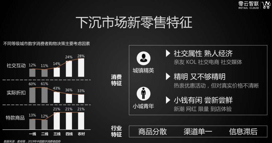 以下内容根据韩吉韬口述整理: 我们团队过去两年在一线城市、二线城市做了新零售的实践,今年我们新创建了一家公司,重点是为一些三四五线城市的区域性连锁零售企业赋能,一起更高效、更低成本的做新零售的升级,在这里把我们这大半年的实践跟大家做一个汇报。 一.下沉市场更重视到店体验在没有深入进入到下沉市场的时候,我们也看了很多行业的数据,跟一些行业的大咖做了交流。之后,过去的大半年时间,我们对用户、对当地的消费情况以及对行业的特点做了一些自己的理解和研究。首先,我们拿了麦肯锡的《2019年年中国数字消费趋势》报告,他们认为消费者未来都是数字化的,有一个结论和我们一年实践蛮相符的,越下沉的市场,用户的社交互动属性越强,熟人经济的属性越强。