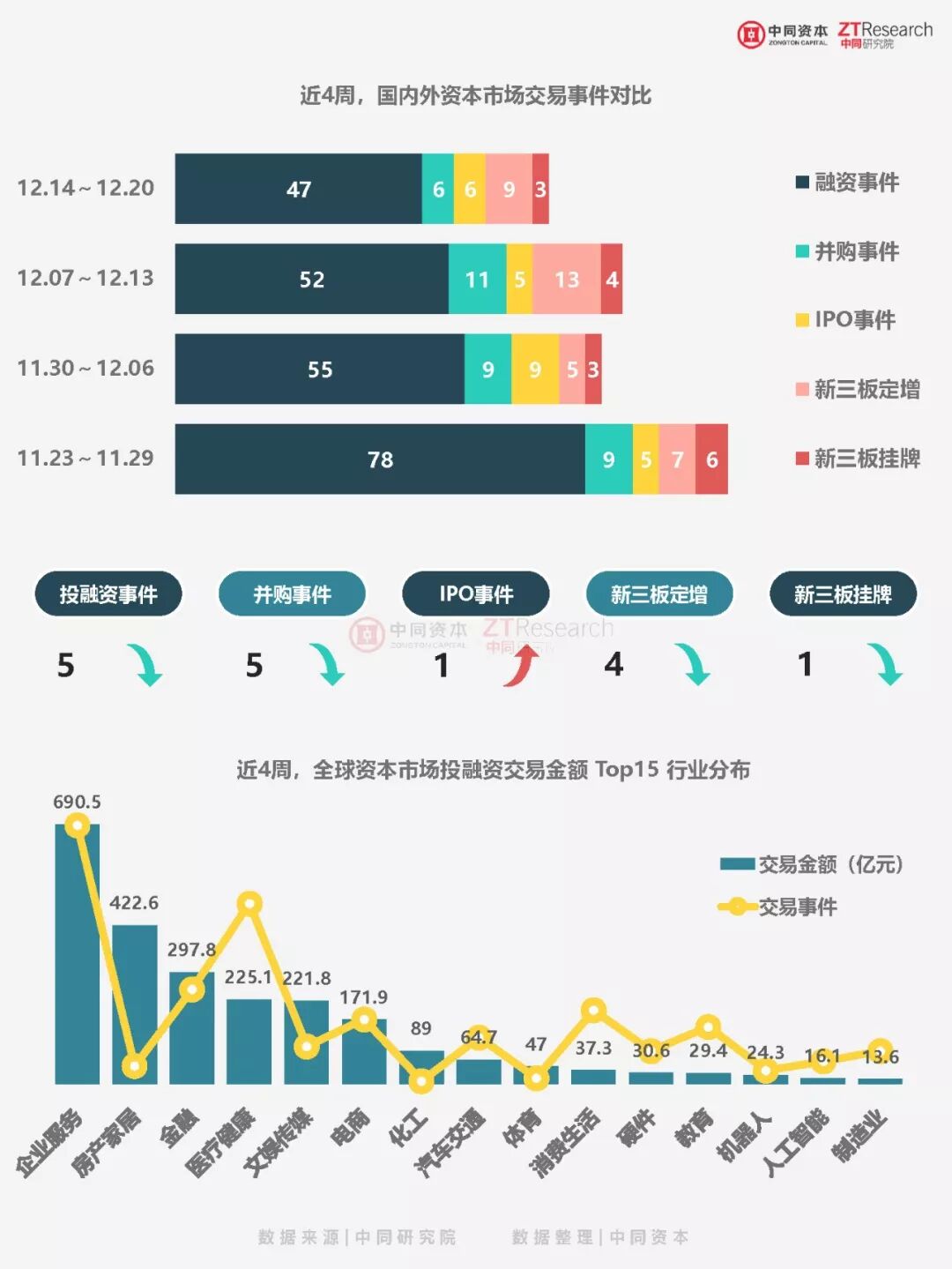 本周共收录投融资事件 47 起,并购事件 6 起,IPO事件 6 起,新三板定增 9 起,新三板挂牌 3 起。