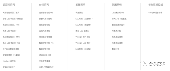 图片来源:官方天猫店 对于未来发展我们预测,一方面家居安防需求增加和安防要求的提高,消费家居监控类智能家电的基数和渗透率将进一步提高;另一方面,5G时代的来临带来高清摄像设备的产品升级换代,数据传输能力的提高也将更大限度的发挥萤石后端萤石云平台的优势,提供更贴近消费者的智能生活服务解决方案。 3.YeelightYeelight是属于青岛亿联客信息技术有限公司旗下的产品品牌。不同于石头科技的清洁智能小家电方向,Yeelight主攻智能照明小家电方向。公司成立于2012年,首款产品不同于扫地机器人的市场测试方式,尝试众筹收获早期的种子用户。2014年也是引入小米投资,成为小米生态链企业之一。