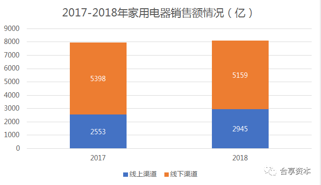数据来自:《中国工业统计年鉴-2017》 注:2017年工业销售产值1.46万亿中有3,585亿是出口交货值 2019年2月中国家用电器研究院和全国家用电器工业信息中心联合发布《2018年中国家电行业年度报告》。报告显示,2018年家电行业销售渠道端零售额达到8,104亿,同比增长1.9%。线上市场零售额2,945亿,同比增长15.3%;线下市场零售额5,159亿,同比下降4.4%。