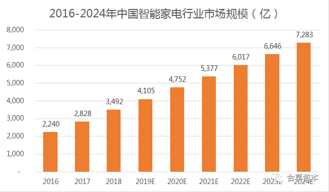 数据来源:《2018年中国家电行业年度报告》 智能小家电是属于智能家电的组成部分。有关资料显示,2018年智能家电行业的规模占家电行业比例从2017年的35%上升到43%,达到了3,492亿规模。预计到2024将保持13%的年复合增长率,规模达到7,283亿。