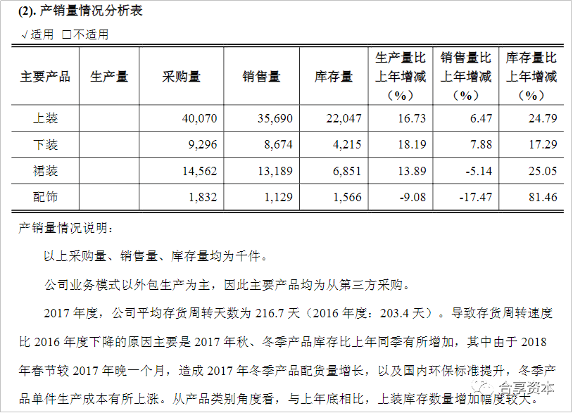 美少女拉夏贝尔有些“虚胖”了。而和大多服装品牌一样,这个“胖”很大程度来源于库存。 根据拉夏贝尔2017年年报中《产销量情况分析表》显示,其上装、下装、裙装、配饰的生产量比上年增长16.73%、18.19%、13.89%、-9.08%。 由于公司主要采用外包生产模式,这里的生产量,实为从第三方采购。 在配饰以外超过两位数的采购增速下,拉夏贝尔的销售量却大跌眼镜。 其同比增长数据分别为6.47%、7.88%、-5.14%、-17.47%。 终端销售速度跟不上采购,仓库里的存货就开始多了起来。 其2017年各产品库存量同比增长了24.79%、17.29%、25.05%、81.46%。