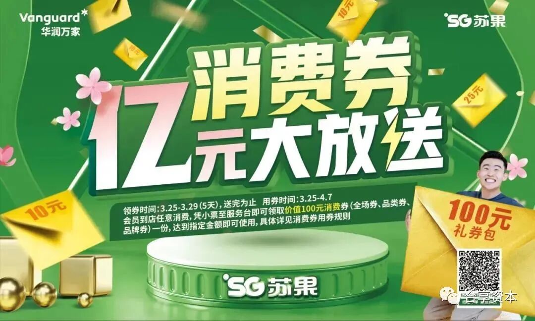 图片来源:沃尔玛中国媒体中心 ✦ 苏果派发消费券 3月25日至29日,苏果面向消费者发放100万份,总价值1亿元的全民消费券,提振消费,促进经济加速回暖。自3月25日发放全民消费券以来,苏果多个重点品类销售实现同比45%以上增长,如冷藏奶品同比增长120%、肉品同比增长180%、调味品同比增长300%......