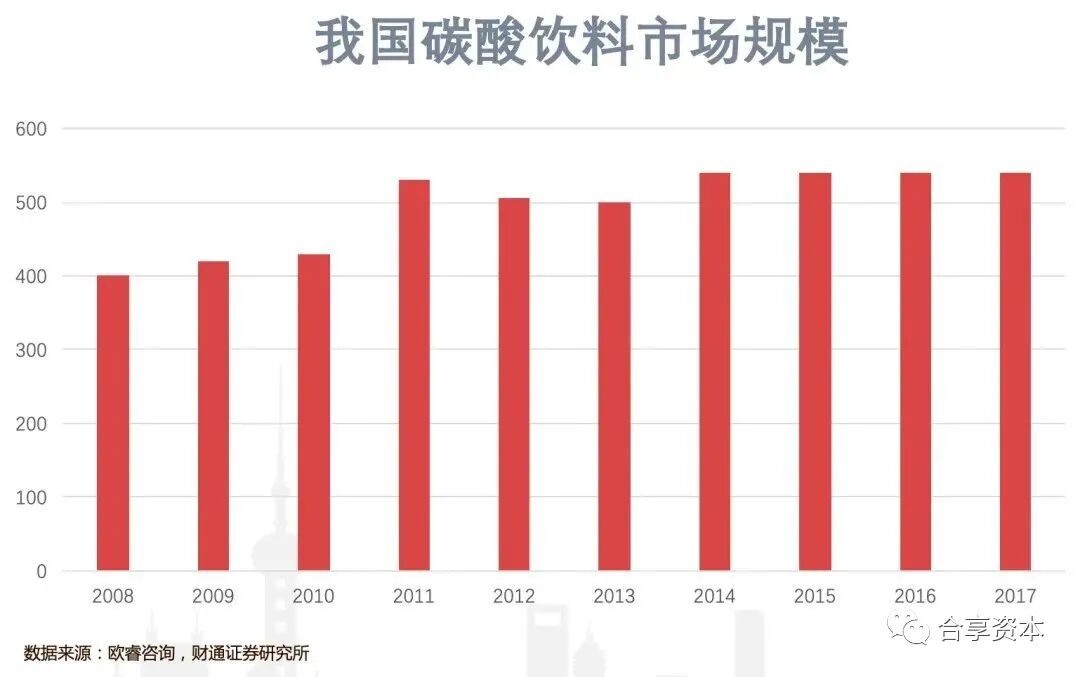 首先来看碳酸饮料,从2012年起我国碳酸饮料市场规规模便开始出现下滑,增速持续走低或趋于停滞,2017年碳酸饮料行业市场份额仅占17.7%,规模约600亿,其中可口可乐、百事可乐两大巨头就占据超过90%的市场份额。