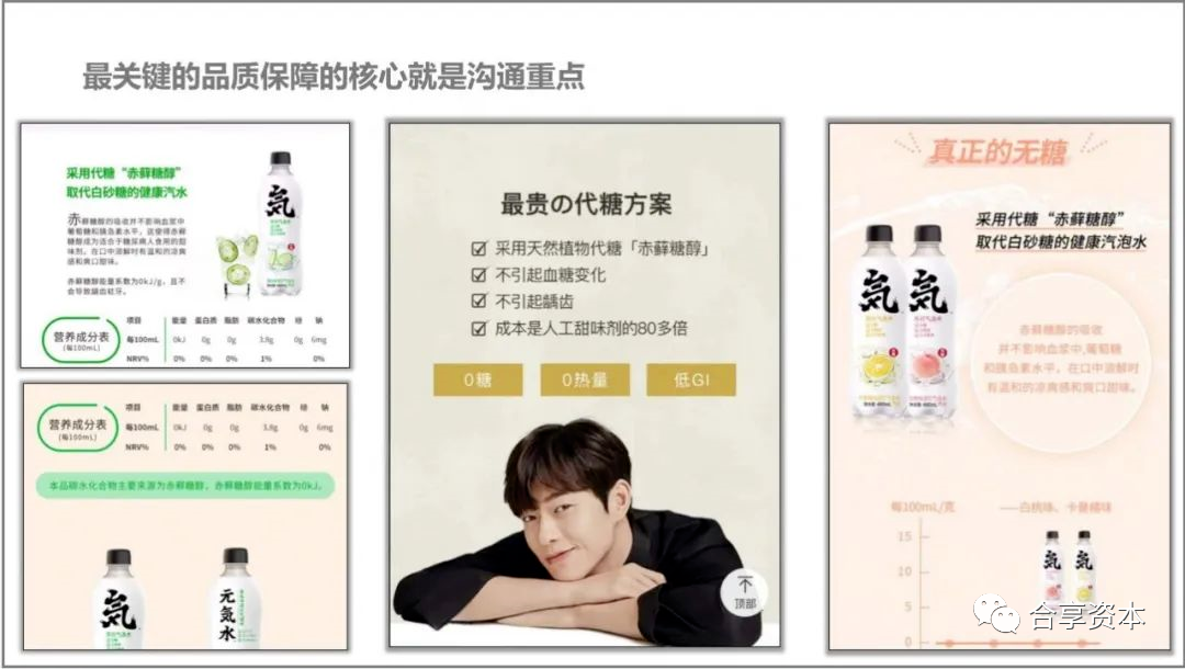 可以看出来,元气森林走的每一步,都是非常稳妥且清晰的打法,并没有上来就大刀阔斧的进行品类改革,而是从消费者熟悉的成熟大品类着手,充分解读目标市场的真实需求,以差异化的产品进入市场,利用自身互联网基因优势,步步为营做出品牌价值。新生代消费者已经变得非常精明和难伺候了,除了基本的功能需求外,能打动他们的产品一定是需要从品质和情感方面得到双重满足。从品质方面需要从方方面面赢得消费者的极致信任,从情感方面需要让消费者透过产品看到品牌传递的生活态度与价值观,并且得到他们的情感认同。也因此产品成为品牌和消费者沟通的最直接有效渠道,企业必须聚焦资源精心打磨极致的好产品,只有足够硬核的产品,才能“自带流量”。那么元气森林是如何通过硬核产品力赢得挑剔的消费者认可的?首先,元气森林产品本身的创新性以及差异化在这里不多谈,我们主要聚焦在元气森林是如何让消费者知道接受并且喜爱的?深谙“且做且说”的营销正道,元气森林不断地通过有效的沟通渠道,向消费者强调元气森林“硬核”的产品力:以产品卖点为最大主题,以品质保障核心为沟通重点,从原料到制作工艺满足消费者所有好奇心,数字化的传达更加增添说服力。